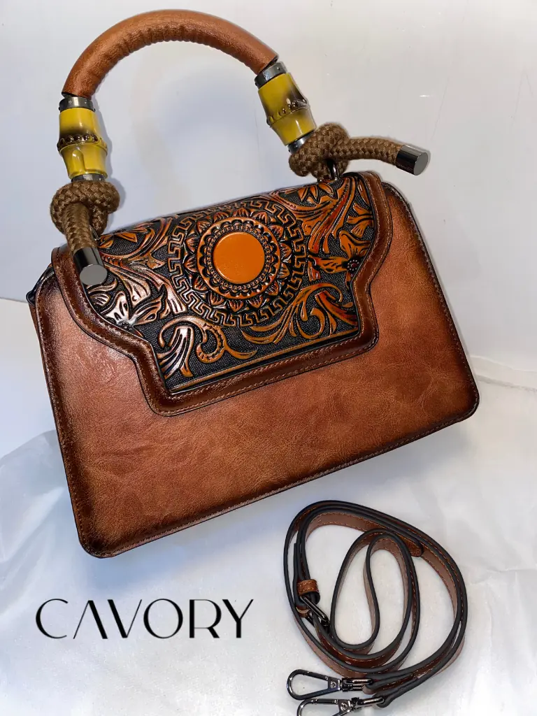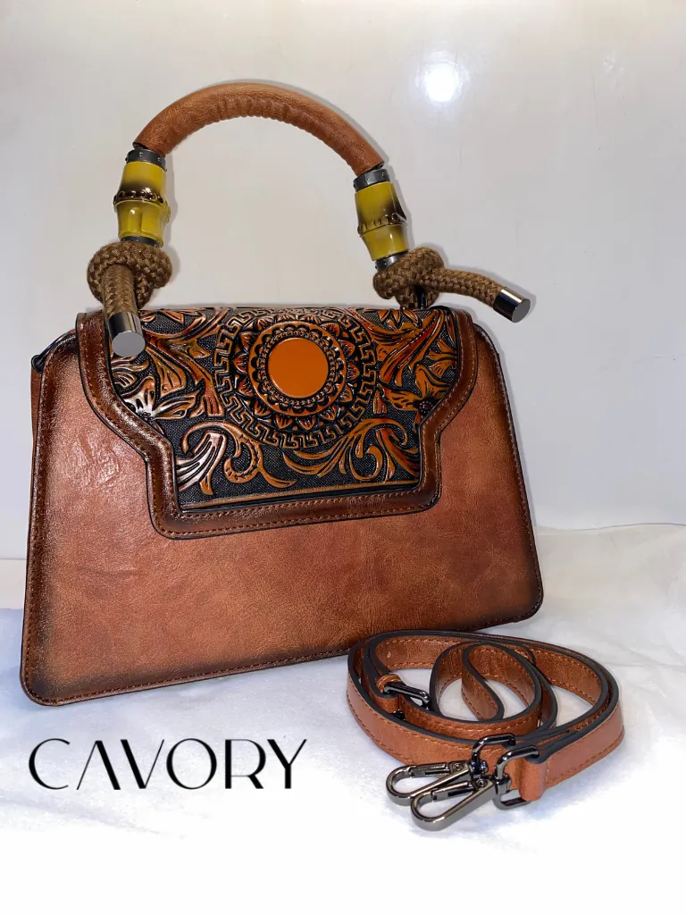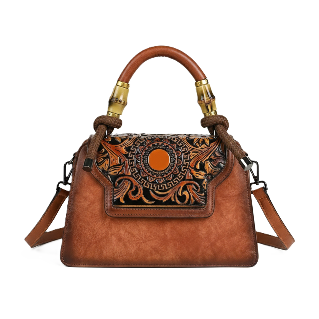 Embrace a blend of vintage charm and bohemian elegance with this exquisite hand-tooled leather satchel. Meticulously crafted from high-quality vegetable-tanned leather, this bag features a captivating hand-carved floral and basketweave design that showcases true artisanal skill. The defining feature of this stunning piece is its uniquely crafted bamboo-style top handles, complemented by decorative leather-wrapped rope accents for a natural, sophisticated touch.