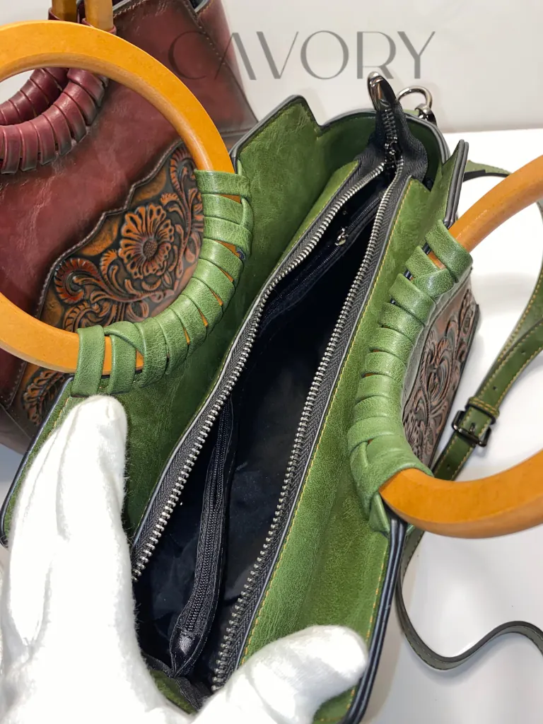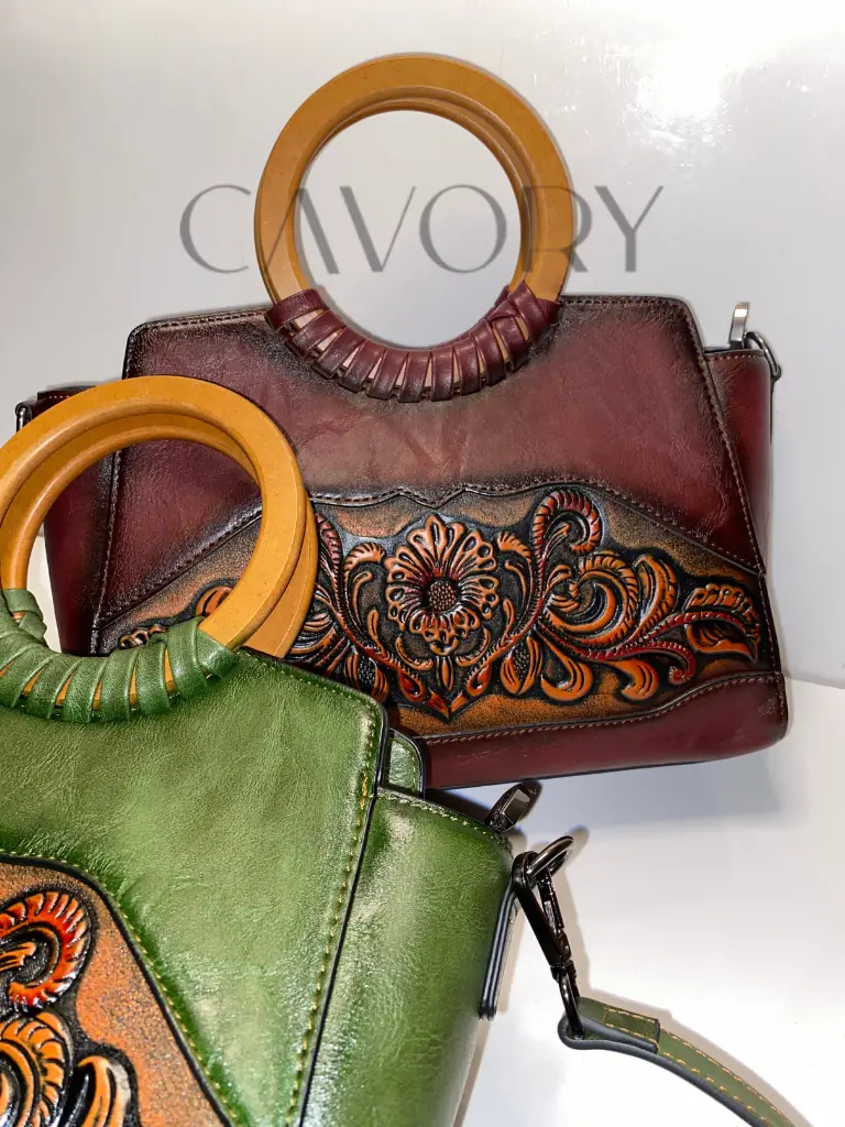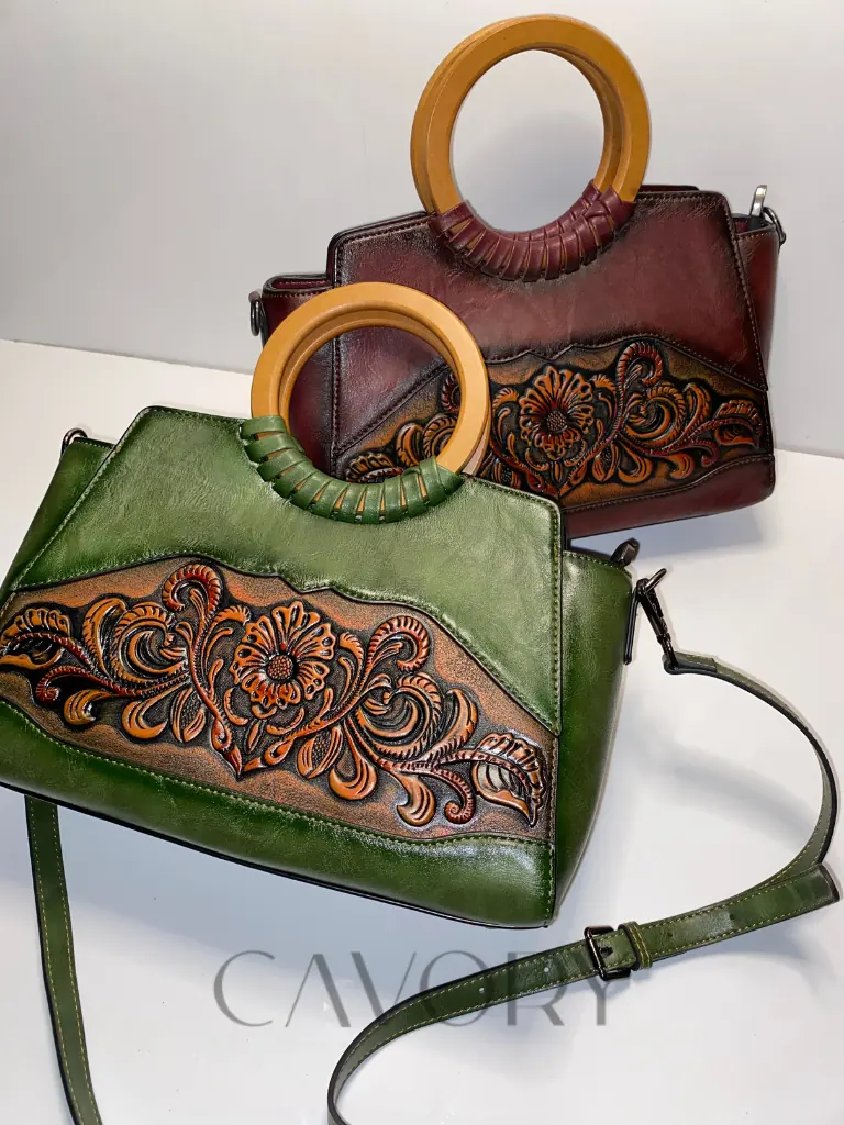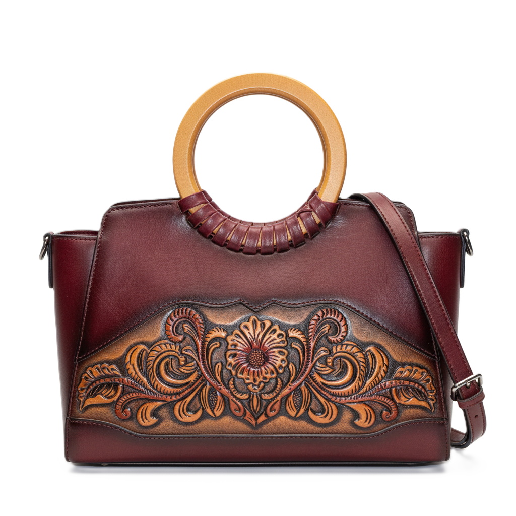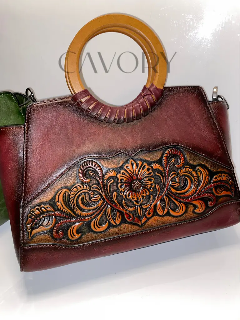 Add a touch of timeless artistry to your collection with this hand-tooled leather satchel. Crafted from high-quality cowhide leather, this bag features stunning sunflower and vine carvings that showcase true artisanal craftsmanship. The unique circular top handle and rich, burnished maroon gradient offer a sophisticated vintage aesthetic that stands out from typical women bags.