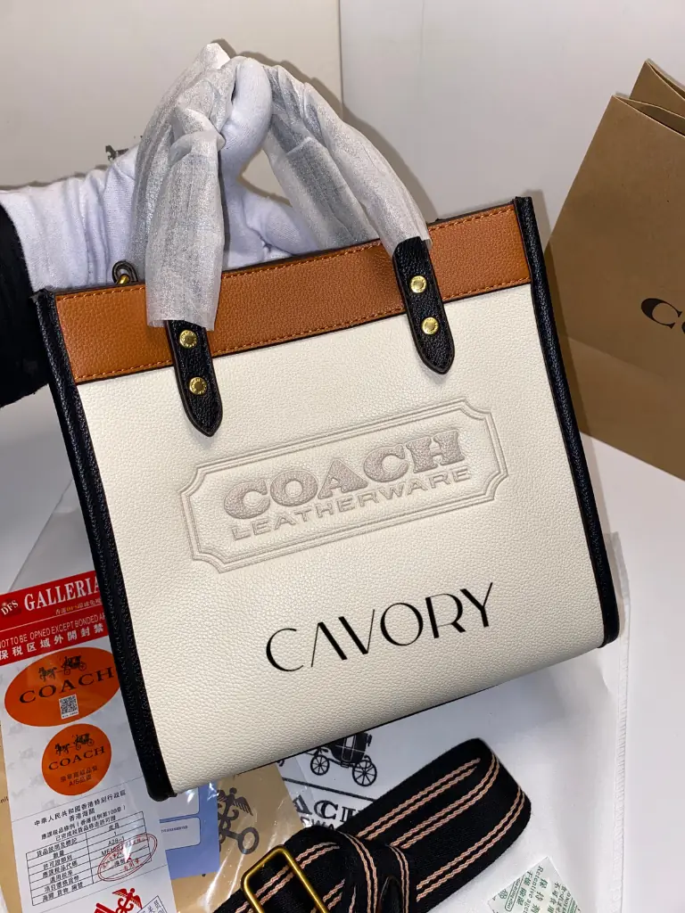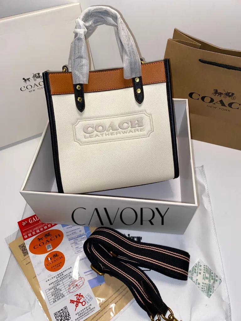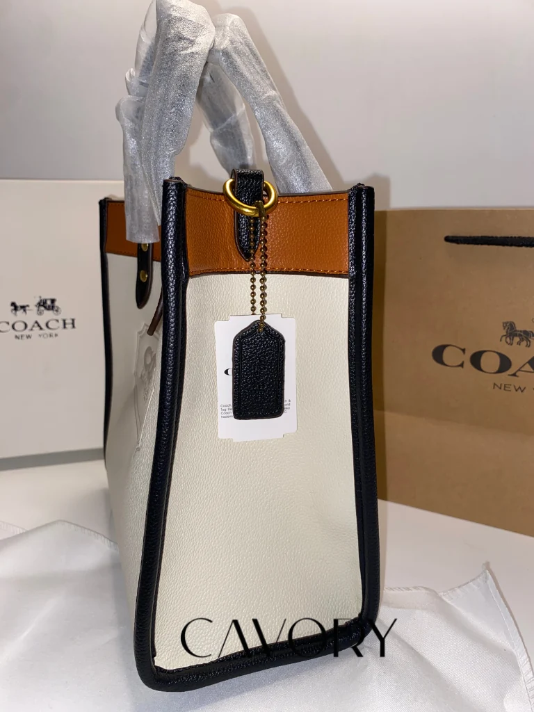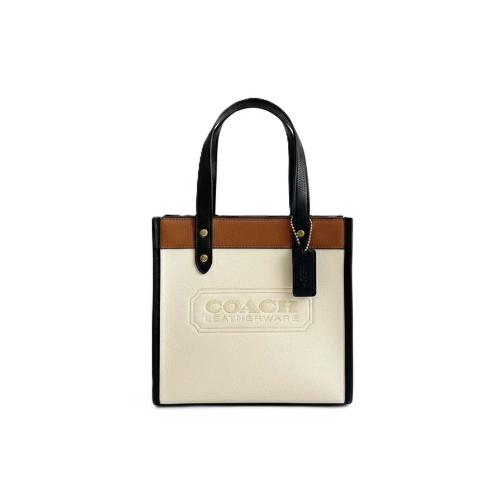 Elevate your everyday look with the Coach Field Tote 22. This versatile bag is crafted from a mix of polished pebble leather and refined leather in a chic white and brown colorblock design. Featuring the embossed “COACH LEATHERWARE” badge on the front, it represents the brand’s long-standing heritage in quality. It is the perfect compact companion for your busy days, offering enough space for all your essentials without being bulky.