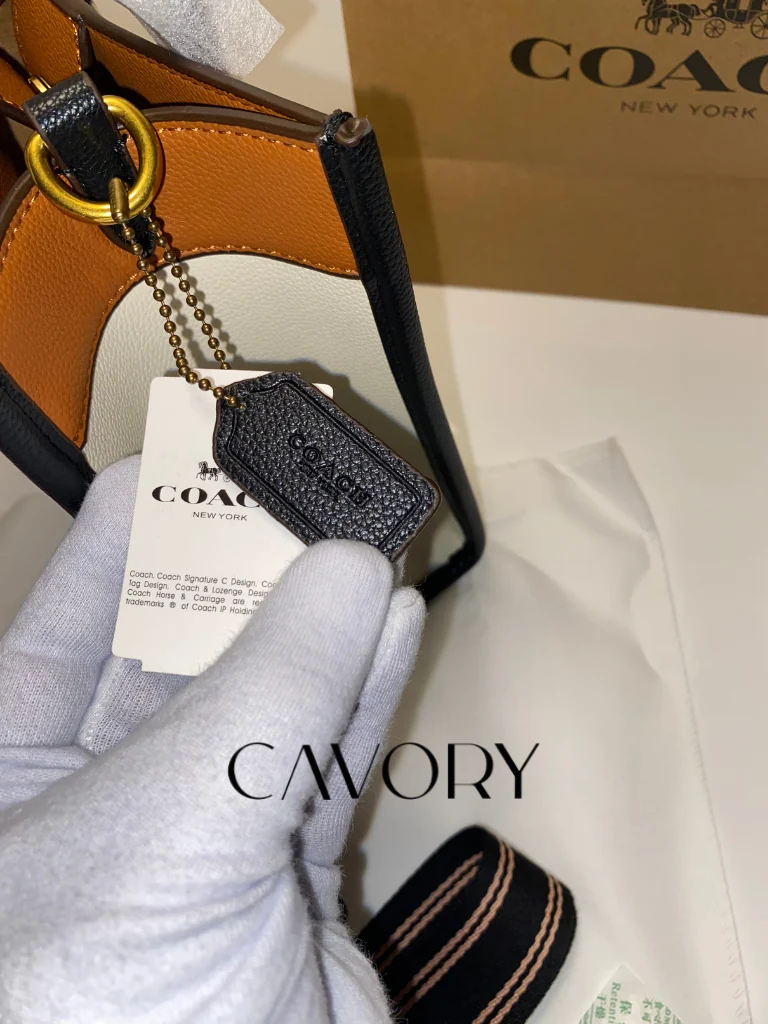 • Branding: Features the iconic “COACH LEATHERWARE” embossed logo and a detachable leather hangtag.