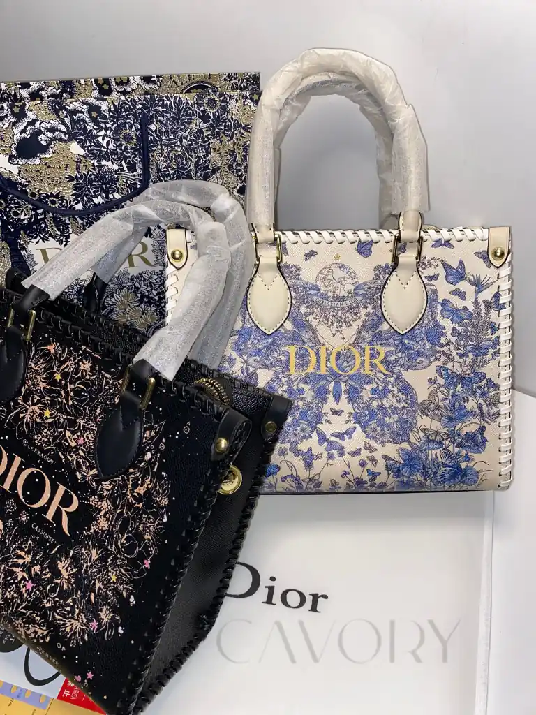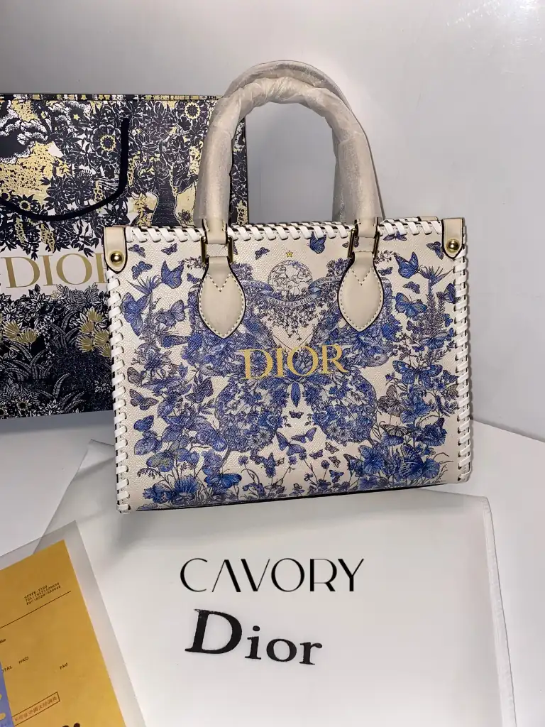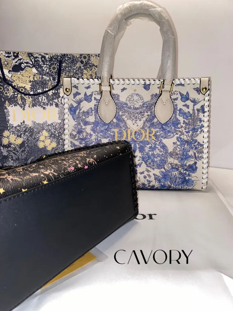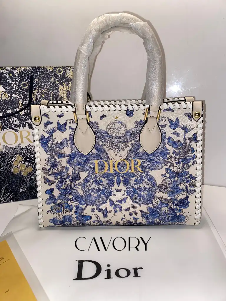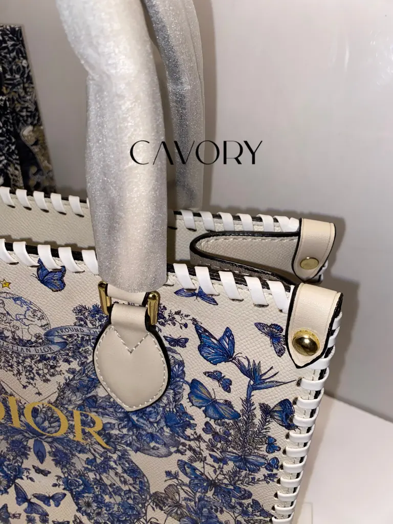 Make a bold statement with this stunning Dior Book Tote, featuring a vibrant blue and white butterfly print that covers the entire silhouette. Unlike traditional styles, this version features a sleek, high-quality printed canvas that captures every fine detail of the artistic motif. As one of the most sought-after women bags in the luxury market, it is elevated by unique braided leather edges and the iconic “DIOR” signature across the front.