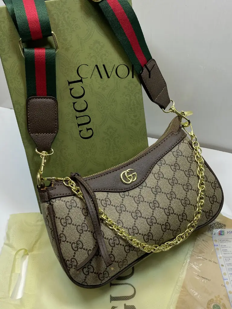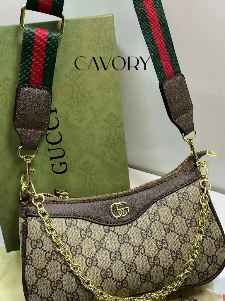 Straps: Includes a fixed gold chain strap and a detachable, adjustable green/red Web shoulder strap.