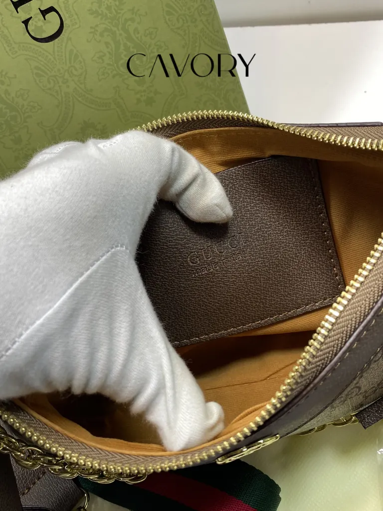 This versatile piece is designed for multiple carrying options. It features a decorative gold-tone chain strap for a sophisticated shoulder look and a detachable green and red Web nylon strap, allowing it to be worn as a sporty crossbody bag. The zip-top closure secures a spacious interior, making it the perfect companion for both day and evening wear.