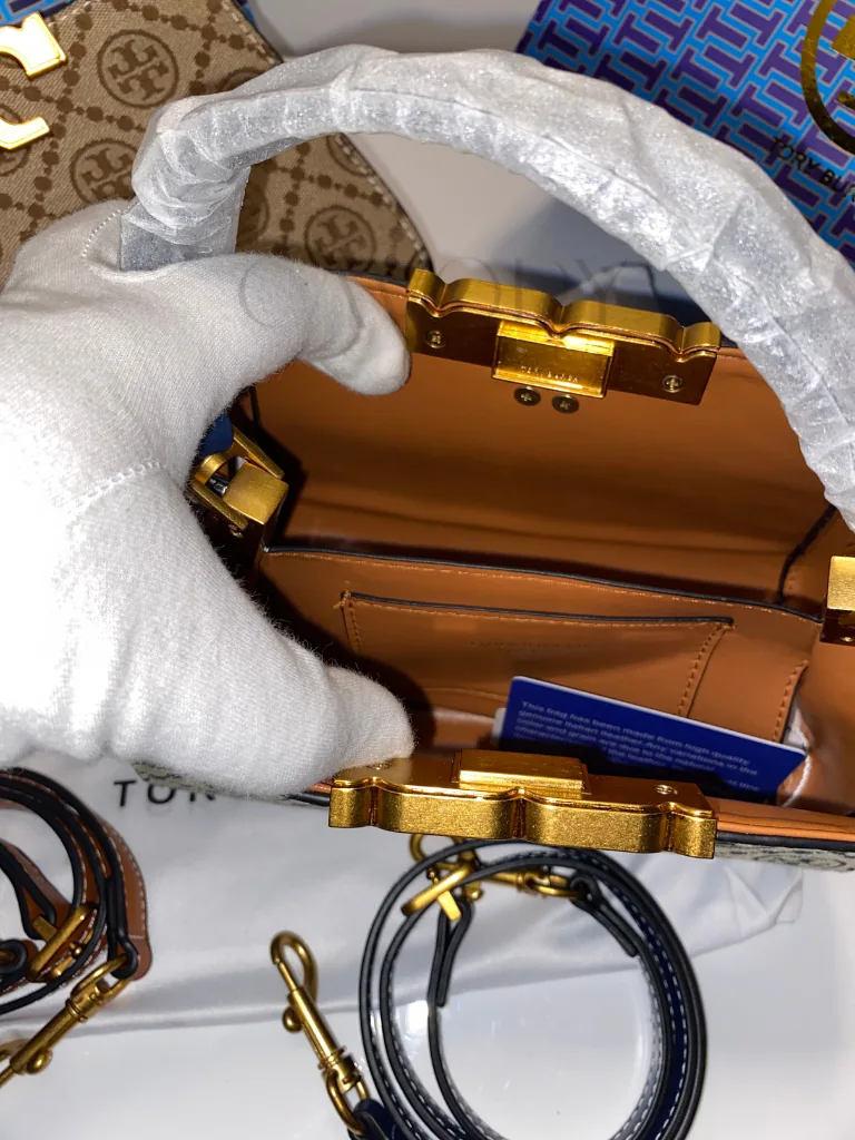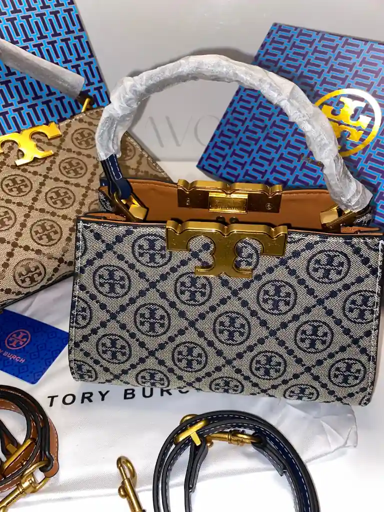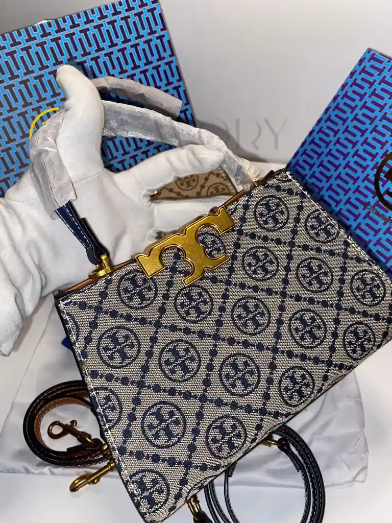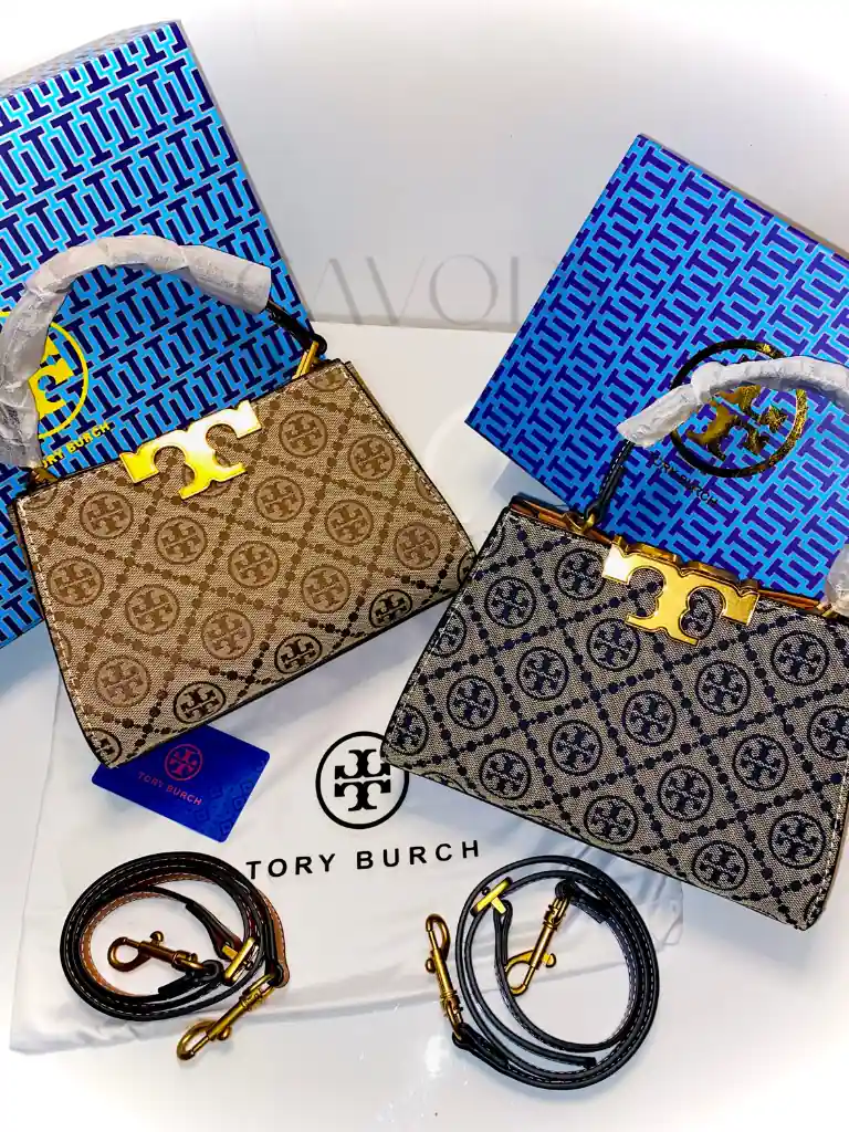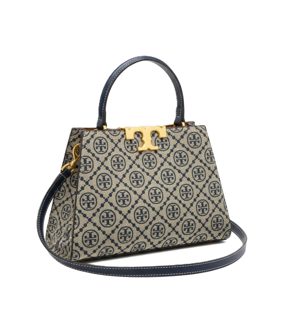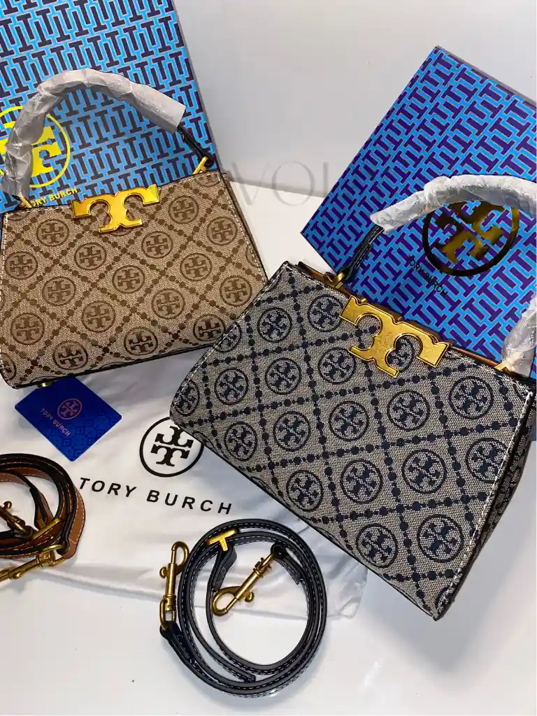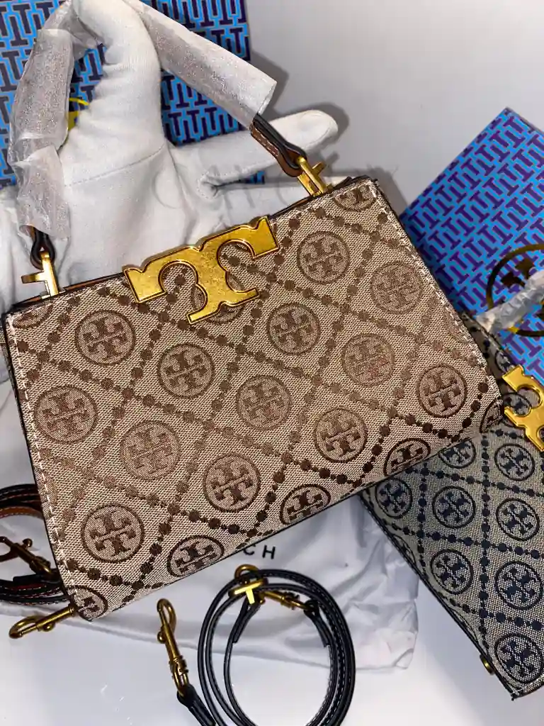 Tory Burch T Monogram Bell Bag. Meticulously crafted from premium woven jacquard and fine leather trim, this bag features the classic pattern inspired by traditional quilting. The striking gold-finish hardware and the signature “T” push-lock closure make it a standout choice for those seeking the finest women bags in the country.