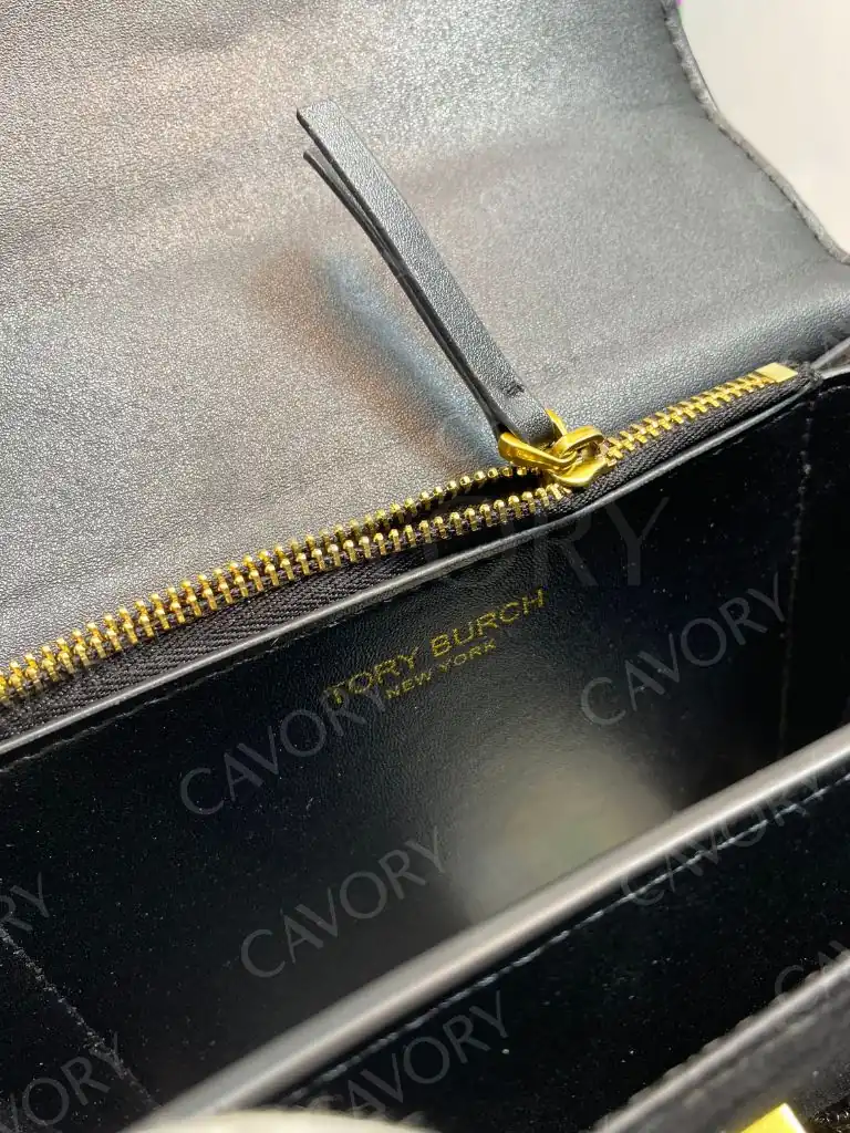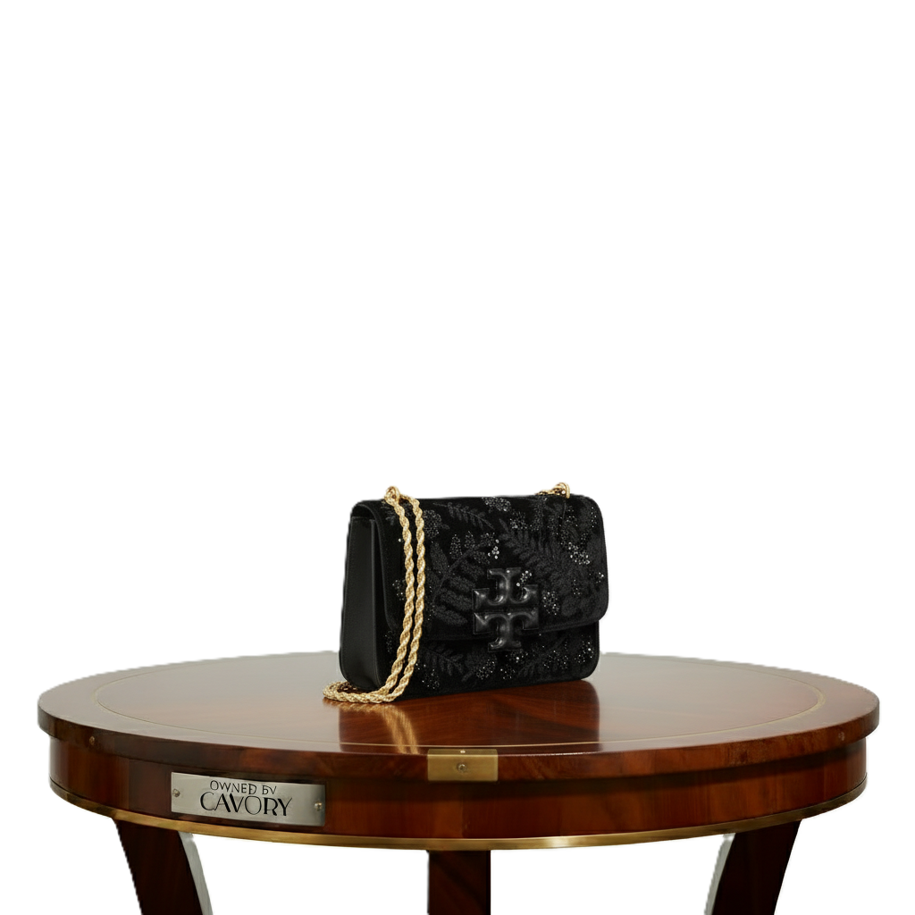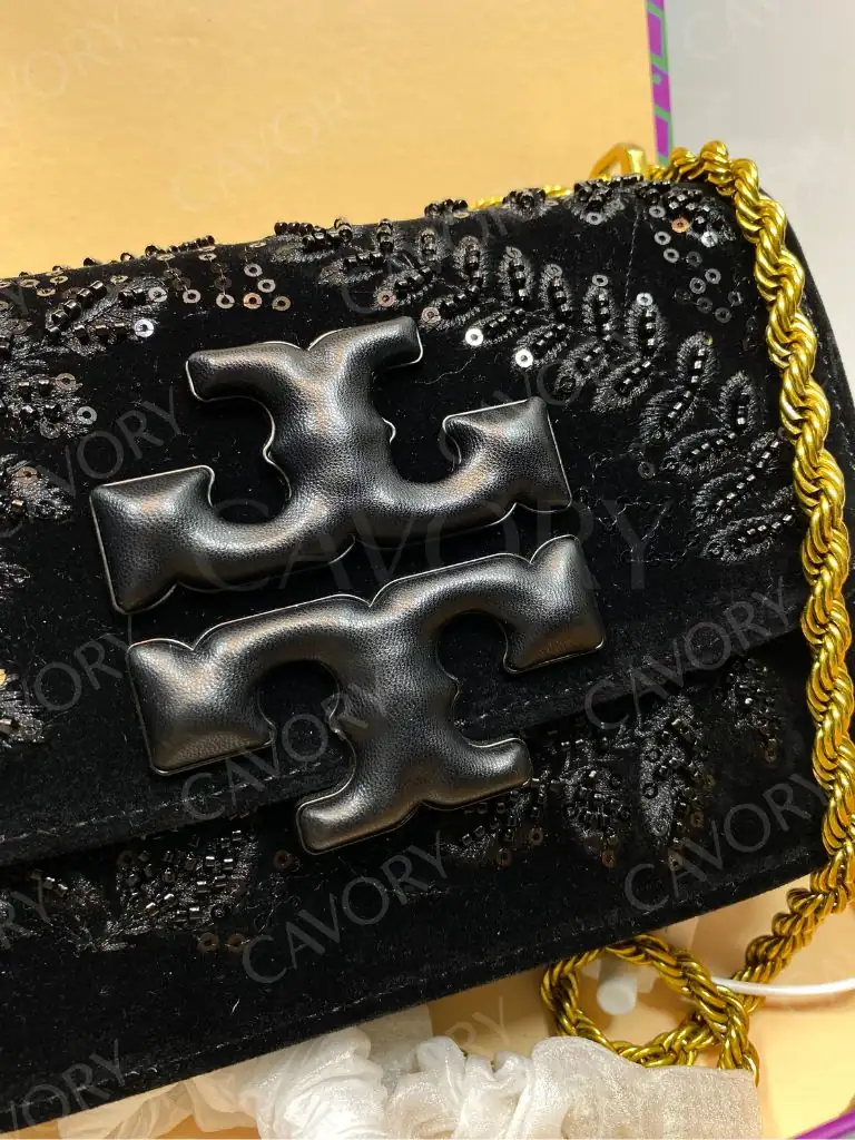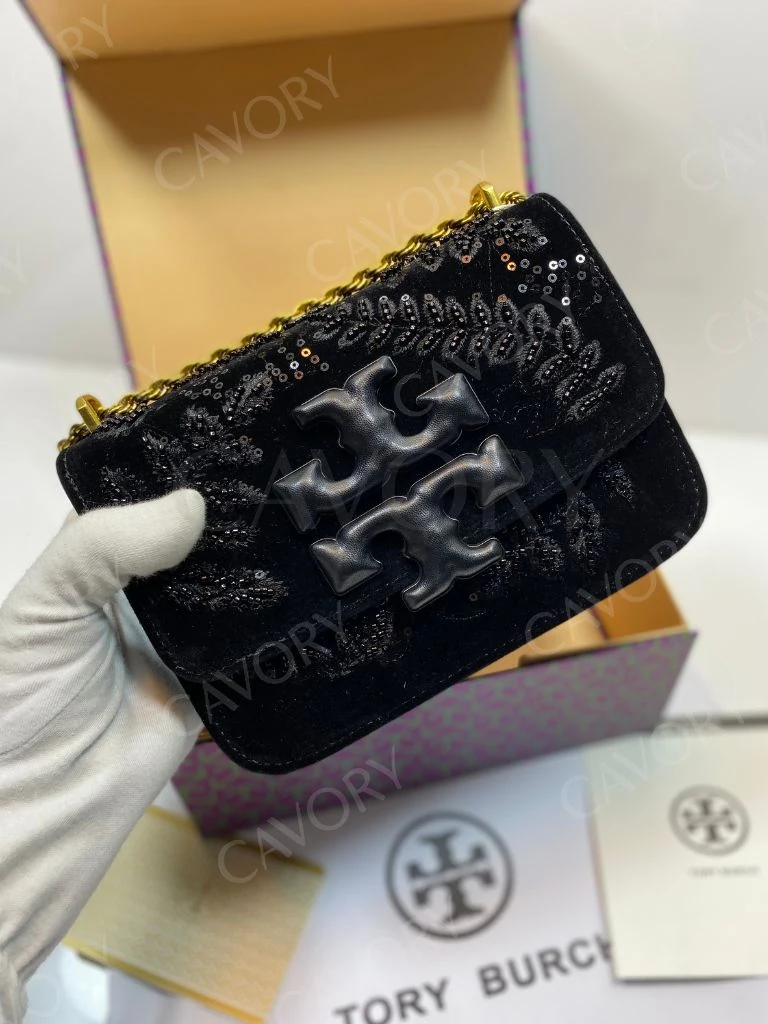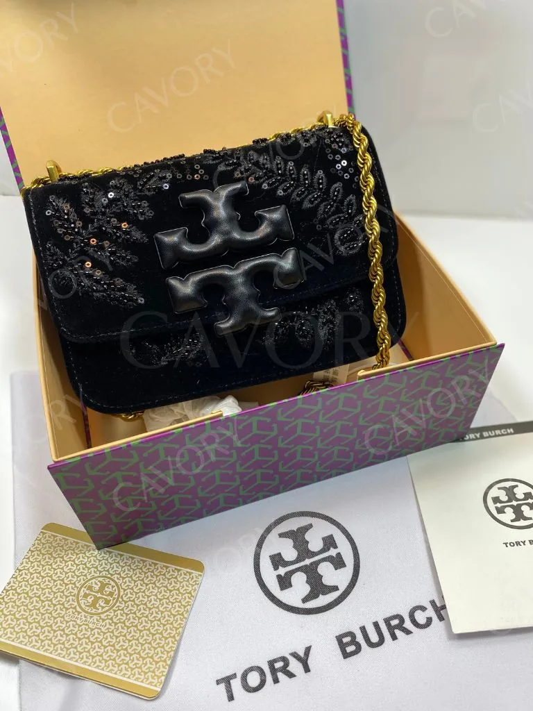 Model: Tory Burch Velvet Shoulder Bag (Small) – Black with Sequins & Signature Logo