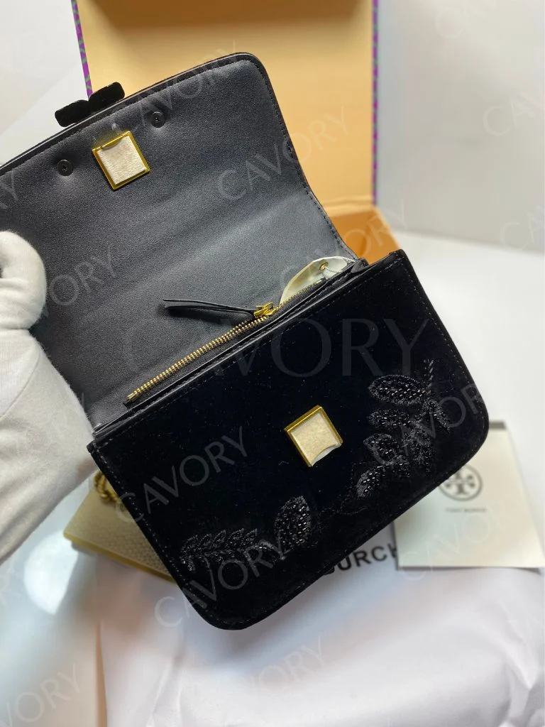 Add a touch of glamour to your look with the Tory Burch Velvet Shoulder Bag, crafted in rich black velvet and detailed with elegant sequins embroidery. The bag features the iconic double T logo in bold black hardware and a gold-tone chain strap for versatile styling. Perfect for parties, dinners, and special occasions, this compact yet chic bag is a must-have for luxury fashion lovers.